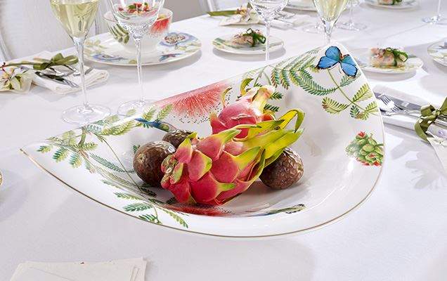 Amazonia is een kleurrijk en exotisch servies met prachtige dessins van blauwe passiebloemen, gele orchideeën, fladderende kolibries en vlinders met groene bladeren als contrast. Met Amazonia zet je het tropische regenwoud op tafel. Alle items zijn afgewerkt met een stijlvolle gouden rand. Amazonia is een extravagant servies met fijne motieven dat je goed kan combineren met andere serviezen. Een goed voorbeeld van tropische diversiteit compleet met dieren- en bloemenprints.Villeroy & Boch Anmut Amazonia
