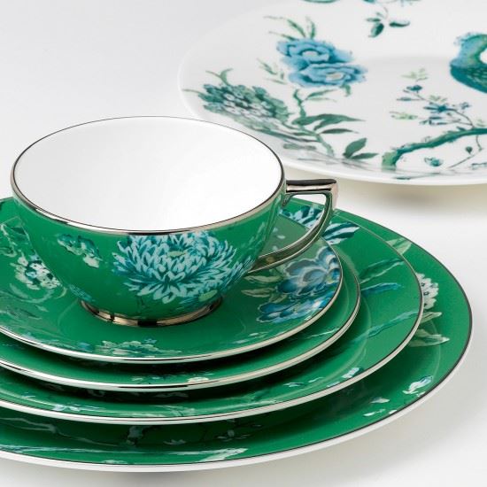 Last but not least dit opvallende groen-witte Jasper Conran Chinoiserie servies van Wedgwood. Ook hier zijn oude patronen uit het Oosten vertaald naar een eigentijds dessin met exotische bloemen, prints van vogels en botanische prints. Stel je dit servies voor op een mooie houten tafel met wil tafellinnen en zilveren bestek. Modern, stijlvol en helemaal volgens de laatste trends! Prachtig.