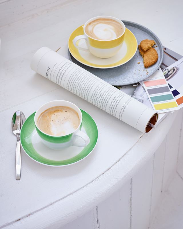 Het servies heeft een lichte basis waarbij het lijkt alsof de kleuren, met een brede penseelstreek, op de randen van de borden en kopjes zijn geschilderd. De kleuren hebben prachtige namen als Winter Sky en Lemon Pie. In totaal zijn er zes frisse, perfect op elkaar afgestemde kleuren, waardoor je naar hartenlust kunt mixen & matchen met dit servies.